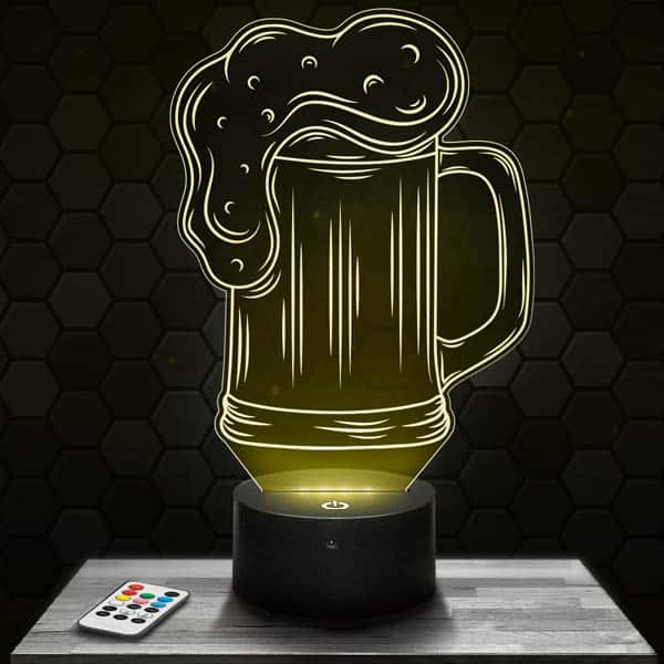 Captivante, surprenante et totalement originale La Lampe 3D Chope  de bière, l’objet tendance du moment !    La totalité des Lampes 3D sont fabriquées par notre équipe, à partir de plexiglass  de 4 ou 5 mm d’épaisseur et transformées avec nos machines de découpe et  gravure laser dans nos bureaux situés à Clermont Ferrand. Le visuel  s’illumine à l’allumage du socle donnant un effet d’hologramme fascinant  !    Pour le salon, la chambre ou bien comme lampe de bureau, apportez une  pointe de modernisme à la maison.    En plus de l’effet d’illusion d’optique incomparable, la lampe 3D Chope de  bière vous donnera une lumière tamisée parfaite pour vos ambiances  intimistes.    Grace aux socles proposés sur lampephoto.fr, vous pourrez modifier les  couleurs autant que vous voudrez. Simplement en touchant la base tactile ou  sans même devoir vous déplacer grâce à la télécommande inclue avec la plupart  des multiples socles proposés.    Votre Lampe 3D Chope de bière n’attend plus que votre choix pour vous être  envoyée aujourd’hui même !    Un des gros avantages de nos articles est la basse consommation en  électricité. Par les temps qui courent, c’est un facteur à auquel il faut  s’attacher, autant pour l’aspect économique que celui de l’écologie. Toutes  les lampes 3D proposées sur notre site ne consomment pas plus de 5W, si ce  n’est même 3 watt pour les plus économiques    Au sujet de l’espérance de vie de nos lampes 3D, elles sont données pour  une durée de fonctionnement minimum de 50000 heures, ce qui correspond si  nous prenons le temps de faire un simple calcul, à plus de cinq ans si l’on  laisse la lampe branchées 24 heures sur 24, 7/7 jours et 365 jours/an. Au cas  où vous seriez confronté à un problème technique dans la première année, tous  les produits du site internet sont garantis 1 an. Nous échangeons tous les  articles en panne sans délais.    N’attendez plus, commandez votre lampe 3D !!!