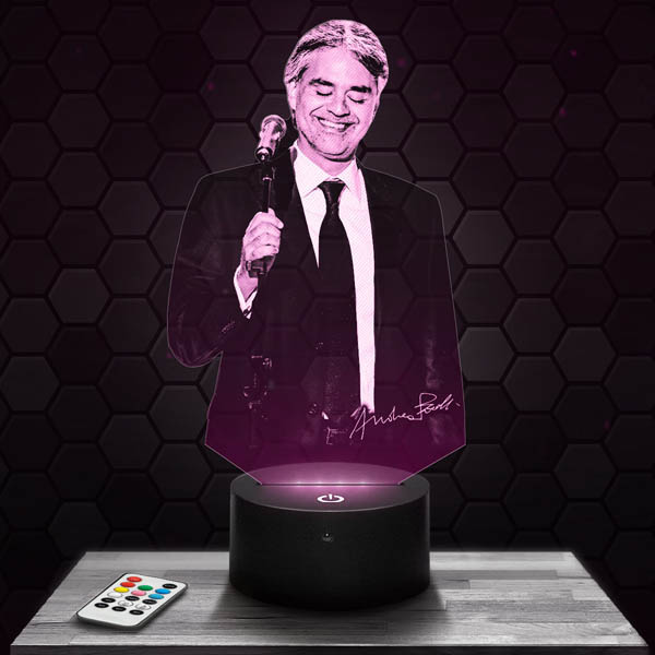 Si vous recherchez un cadeau d’anniversaire ou de Noël original, la lampe  3D Andrea Boccelli est le choix parfait. Avec son design élégant et son  visuel captivant, cette lampe ravira les fans de musique classique et  d’opéra. Grâce à la télécommande incluse, vous pourrez facilement changer la  couleur de la lampe selon vos envies. De plus, notre catalogue propose plus  de 500 modèles au choix, vous permettant de trouver la lampe parfaite pour  chaque passionné de musique.