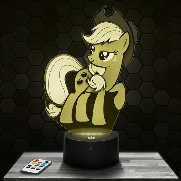 Découvrez la lampe Applejack My Little Pony, un produit incontournable pour tous les fans de la série animée. Cette lampe 3D est dotée d’une plaque en verre acrylique gravée en haute définition et découpée au laser dans nos ateliers à Clermont-Ferrand. Avec son socle lumineux Noir Led RVB tactile et sa télécommande, vous pourrez choisir parmi 7 couleurs différentes pour illuminer votre lampe. Lorsque vous allumez le socle, le visuel de la lampe s’illumine, créant un effet d’hologramme fascinant. Parfait pour décorer votre salon, votre chambre ou même votre bureau, cette lampe est également idéale comme cadeau d’anniversaire ou de Noël.