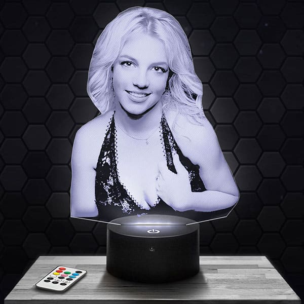 \nPetit Concentré de technologie au look néo futuriste, La Lampe 3D Britney Spears, le cadeau parfait pour les amis, la famille, les enfants, à offrir en toutes occasions ou pour se faire plaisir à soit même.\nLes Lampes sont faites de plaques de plexiglass gravées et découpées au laser par nos soins dans le Puy de Dôme. Lors de la mise en marche de la lampe, vous serez fasciné par l’effet d’hologramme que cela provoque.\nPour vos pièces de vie ou bien en veilleuses pour une chambre d’enfant, ajoutez une pointe de modernisme au cocon familiale.\nEn plus de l’illusion d’optique exceptionnel, la lampe 3D Britney Spears émettra une lumière tamisée parfaite pour vos ambiances entres amis.\nPour finir, vous pourrez choisir le socle que vous préférez parmi tous les modèles que nous proposons comme le socle basique, le socle horloge, les cadres photos… La plupart de nos socles sont tactiles et livrés avec la télécommande pour modifier les couleurs selon vos humeurs.\nVotre Lampe 3D Britney Spears n’attend plus que votre choix pour vous être expédiée dès aujourd’hui !\nAu niveau de la consommation en énergie, nos lampes se veulent vraiment économiques. De ce fait, chacun de nos modèles consomment de 3 à 5 watt, ce qui est vraiment très peu pour une lampe.\nParlons de la longévité de nos bases lumineuses, elles sont fabriquées pour une espérance de vie minimum de 50 000 Hrs, ce qui correspondrai si nous prenons le temps de faire un rapide calcul, à plus de cinq ans en laissant la lampe 3D branchées 24H/24, 7 jours sur 7 et 365 jours/an. Dans le cas où vous seriez confronté à un problème technique dans les premiers temps, tous les produits du site lampephoto.fr sont garantis 1 an. Nous échangeons tous les produits dysfonctionnels dans les plus brefs délai.\n\nDes questions techniques? Visitez notre FAQ\n\nDes questions sur la livraison? Cliquez ici\n