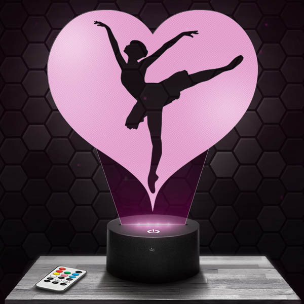 \nDécouvrez la lampe Danseuse Coeur, un véritable chef-d’œuvre alliant technologie et élégance. Cette lampe 3D est dotée d’une plaque en verre acrylique gravée en haute définition et découpée au laser dans nos ateliers à Clermont-Ferrand. Son socle lumineux Noir Led RVB tactile avec télécommande offre une expérience visuelle unique.\n