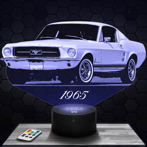 \nÀ la fois attrayante et originale La Lampe 3D Ford Mustang 1965, l’objet déco du moment ! Les Lampes 3D sont conçues à partir de plaques de plexiglass gravées et découpées au laser dans nos locaux situés à Clermont Ferrand. Lors de l’allumage de la lampe, vous serez fasciné par l’effet d’hologramme qui en résulte. Pour le salon, la chambre ou bien en veilleuses pour une chambre d’enfant, apportez une pointe de modernisme au cocon familiale. Si vous aimez les ambiances feutrées, en plus de l’effet d’optique fascinant vous serez charmé par la lumière tamisée dégagée par La Lampe 3D Ford Mustang 1965. Et ce n’est pas tout, vous pourrez choisir le socle de votre choix parmi tous les modèles que nous proposons comme le socle basique, le socle réveil matin, le socle enceinte Bluetooth… presque tous nos socles sont tactiles et livrés avec une télécommande pour interchanger les couleurs selon vos humeurs. Choisissez le modèle qui sublimera votre Lampe 3D Ford Mustang 1965 ! Un des principaux avantages de nos articles est la basse consommation électrique. De nos jours, c’est un facteur à connaitre, tant pour le côté économique que pour celui de l’écologie. Toutes les lampes 3D proposées sur notre site ne consomment jamais plus de 5W, si ce n’est même 3 watt pour les plus économiques Au sujet de l’espérance de vie de nos bases lumineuses, elles sont données pour une espérance de vie moyenne de 50000 heures, ce qui correspond si nous prenons le temps de faire le calcul, à environ cinq ans en gardant la lampe 3D en fonction 24 heures sur 24, 7 jours sur 7 et 365 jours/an. Dans le cas où vous rencontriez une défaillance matérielle dans la première année, tous les articles vendus sur le site sont garantis 1 an. Nous échangeons tout produits en panne dans les plus brefs délai.\n\nDes questions techniques? Visitez notre FAQ\n\nDes questions sur la livraison? Cliquez ici\n