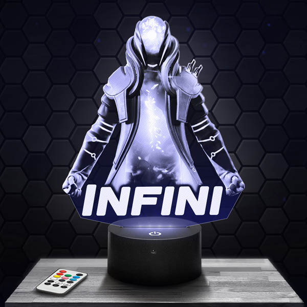 \nÀ la fois surprenante et originale La Lampe 3D Fortnite – Infini, la touche déco du moment !\nLes Lampes sont faites de plaques de plexiglass gravées et découpées au laser dans notre boutique à coté de Clermont Ferrand. Lors de la mise en marche de la lampe, vous serez impressionné par l’effet d’illusion que cela provoque.\nPour vos pièces de vie ou bien comme lampe de bureau, apportez une touche de modernisme au cocon familiale.\nSi vous aimez les ambiances intimes, en plus de l’effet d’optique impressionnant vous serez comblé par la lumière tamisée émise par La Lampe 3D Fortnite – Infini.\nEt ce n’est pas tout, vous allez pouvoir choisir la base lumineuse que vous préférez parmi tous les modèles que nous proposons tel que le socle basique, le socle réveil matin, le socle enceinte Bluetooth… La plupart de nos socles sont tactiles et fournis avec une télécommande pour modifier les couleurs selon vos humeurs.\nPlus qu’à choisir le modèle qui sublimera votre Lampe 3D Fortnite – Infini !\nUn des principaux avantages de nos articles est leur basse consommation en énergie. De nos jours, c’est un facteur à considérer, autant pour l’aspect économique qu’écologique. Les lampes vendues via notre site web ne consomment jamais plus de 5 watt, voir même 3 watt pour les plus économiques\nAu sujet de la longévité de nos lampes 3D, elles sont données pour une durée d’environ 50000 heures, ce qui équivaut si nous faisons un rapide calcul, à environ cinq ans en gardant la lampe 3D allumée 24 heures sur 24, 7 jours sur 7 et 365 jours/an. Au cas où vous seriez confronté à un problème technique dans la première année, tous les produits du site lampephoto.fr sont garantis 1 an. Nous échangeons tous les articles en panne très rapidement.\n\nDes questions techniques? Visitez notre FAQ\n\nDes questions sur la livraison? Cliquez ici\n