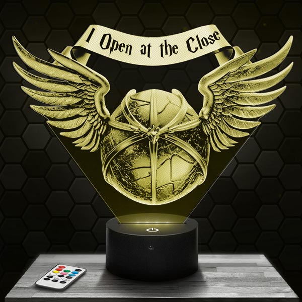 Capturez l’essence du Quidditch et le frisson de la poursuite avec notre lampe 3D Harry Potter Vif d’Or. Cette création élégante, gravée sur acrylique, représente le Vif d’Or en vol, prêt à être attrapé, illuminé par un socle LED RVB proposant un éventail de sept couleurs dorées et magiques. Elle est parfaite pour tous ceux qui rêvent de voler et de victoire.