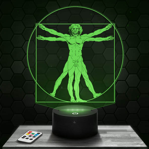 Que ce soit pour le salon, la chambre ou comme lampe de bureau, notre lampe “Homme de Vitruve Leonard De Vinci” apportera une touche artistique et élégante à votre intérieur. C’est également un cadeau parfait pour un anniversaire ou pour Noël. La télécommande incluse vous permet de changer facilement les couleurs et de créer une atmosphère unique. Avec plus de 500 modèles au choix, notre site E-commerce “lampephoto” propose le plus grand catalogue d’Europe en matière de lampes 3D. De plus, notre lampe a une faible consommation d’énergie (<5W) et peut être alimentée par piles ou par câble USB. Ne perdez pas de temps, commandez dès maintenant votre lampe "Homme de Vitruve Leonard De Vinci" et profitez d'un délai de fabrication de seulement 24 heures. Offrez-vous une pièce unique qui allie harmonie, sciences et symbole de la Renaissance.\n