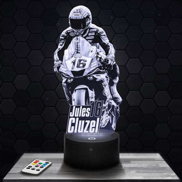 La lampe 3D Jules Cluzel est le cadeau idéal pour tout amateur de courses de moto et de compétition. Que ce soit pour un anniversaire ou Noël, cette lampe ravira les fans de Jules Cluzel. La télécommande incluse permet de personnaliser facilement les couleurs, ajoutant une touche énergique à votre décoration. Cette lampe unique en son genre est parfaite pour créer une atmosphère digne des grands prix de MotoGP.