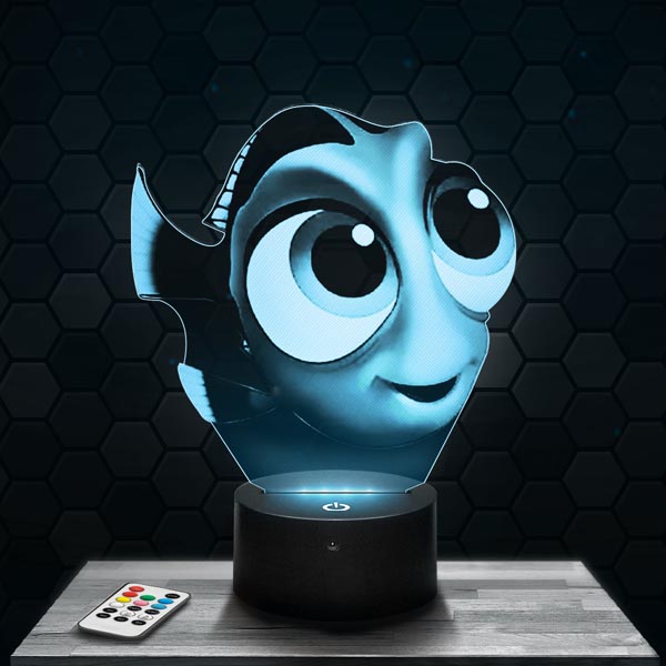 \nDéroutante, attrayante et foncièrement originale La Lampe 3D Le Monde de Nemo – Bébé Dory, l’article de décoration du moment !Les Lampes sont faites de plaques de plexiglass gravées et découpées au laser dans notre boutique à coté de Clermont Ferrand. L’image s’illumine à la mise en route du socle donnant un effet d’hologramme étonnant !En lampe de lecture, d’ambiance, ou encore de bureau, donnez un coup de jeune à votre intérieur !Si vous aimez les atmosphères intimes, en plus de l’effet d’optique captivant vous serez ravi par la lumière tamisée dégagée par La Lampe 3D Le Monde de Nemo – Bébé Dory.Grace aux bases lumineuses proposées sur lampephoto.fr, vous pourrez modifier les couleurs sans limites. Simplement en touchant le socle tactile ou sans même devoir vous déplacer avec la télécommande fournie avec la plupart des différents socles proposés.Votre Lampe 3D Le Monde de Nemo – Bébé Dory n’attend plus que votre choix pour vous être envoyée dès aujourd’hui !Un des principaux avantages de nos articles est la basse consommation en énergie. A l’heure actuelle, c’est un facteur à connaitre, tant pour le côté économique que pour celui de l’écologie. Toutes les lampes 3D à la vente sur notre site ne consomment pas plus de 5 watt, voir même 3 watt pour les moins gourmandesParlons de la durée de vie de nos lampes 3D, elles sont conçues pour une durée de fonctionnement moyenne de cinquante mille heures, ce qui équivaut en faisant un rapide calcul, à plus de cinq ans si l’on laisse la lampe 3D allumée 24 heures sur 24, 7/7 jours et 365 jours par an. Mais dans l’hypothèse où vous rencontriez un souci technique dans la première année, tous les produits du site lampephoto.fr sont garantis 1 an. Nous remplaçons tout socles dysfonctionnels dans les plus brefs délai.Des questions techniques? Visitez notre FAQDes questions sur la livraison? Cliquez ici\