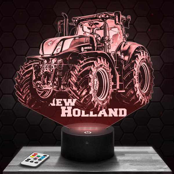 \nConcentré de technologie actuelle, La Lampe 3D New Holland Tracteur Agricole, le cadeau parfait pour toutes les occasions à offrir en toutes occasions ou pour se l’offrir à soit même. Toutes nos lampes sont Conçues par nos techniciens, à partir de plexiglass de 4 ou 5 mm d’épaisseur et usinées avec nos machines de découpe et gravure laser dans nos locaux situés dans le Puy de Dôme. Lors de l’allumage de la lampe, vous serez bluffé par l’effet d’illusion qui en résulte. Pour vos pièces de vie ou bien en veilleuses pour une chambre d’enfant, ajoutez une nouvelle ambiance lumineuse au cocon familiale. Si vous aimez les atmosphères feutrées, en plus de l’effet d’optique déroutant vous serez charmé par la lumière tamisée que vous offrira La Lampe 3D New Holland Tracteur Agricole. Et ce n’est pas tout, vous pourrez choisir le socle de votre choix parmi tous les modèles présentés tel que le socle premium blanc, le socle réveil matin, le socle enceinte Bluetooth… presque tous nos socles sont tactiles et livrés avec une télécommande pour changer les couleurs selon vos humeurs. Votre Lampe 3D New Holland Tracteur Agricole attend vos instructions pour vous être expédiée aujourd’hui même ! Au niveau de la consommation en énergie, nos lampes se veulent très clairement écologiques. En effet, nos différents modèles consomment entre 3W et 5W, ce qui est extrêmement peu pour un luminaire. Au sujet de la longévité de nos lampes 3D, elles sont fabriquées pour une durée de fonctionnement d’environ cinquante mille heures, ce qui correspondrai en faisant un simple calcul, à environ 5 ans en gardant la lampe en fonction 24H/24, 7/7 jours et 365 jours par an. Au cas où vous rencontriez un problème technique dans les premiers temps, tous les articles vendus sur le site sont garantis 1 an. Nous remplaçons tout produits défectueux immédiatement.\n\nDes questions techniques? Visitez notre FAQ\n\nDes questions sur la livraison? Cliquez ici\n
