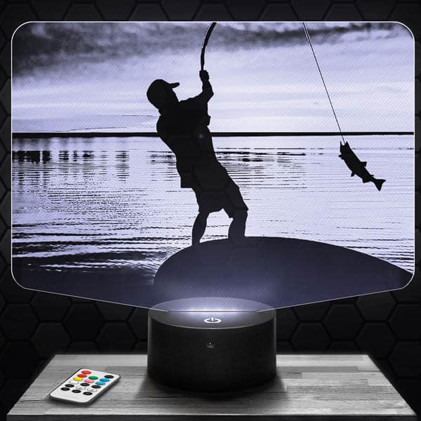 À la fois surprenante et moderne La Lampe 3D Pêche, le cadeau idéal pour les amis, la famille, les enfants, à offrir à ceux que vous aimez ou pour vous tout simplement. Les Lampes 3D sont conçues à partir de plaques de plexiglass gravées et découpées au laser dans nos locaux situés à Clermont Ferrand. Le visuel s’éclaire à la mise en route du socle donnant un effet d’hologramme bluffant ! En lampe de salon, de chevet, ou encore de bureau, donnez un coup de jeune à votre intérieur ! En plus de l’effet d’illusion d’optique parfait, la lampe 3D Pêche dégagera une lumière tamisée parfaite pour vos ambiances détentes. De plus, vous pourrez choisir la base lumineuse que vous souhaitez parmi tous les modèles présentés tel que le socle basique, le socle horloge, le socle enceinte Bluetooth… presque tous nos socles sont tactiles et fournis avec la télécommande pour changer les couleurs à votre guise. Votre Lampe 3D Pêche attend vos instructions pour vous être expédiée dès maintenant ! Un des principaux points positifs de nos lampes est la basse consommation électrique. Par les temps qui courent, c’est un facteur à prendre en compte, autant pour le côté économique que celui de l’écologie. Tous nos modèles de lampes à la vente via notre site web ne consomment pas plus de 5 watt, si ce n’est même 3 watt pour certains socles lumineux Nos engagements : vous garantir la totalité de nos produits pour une durée de 1 an. La qualité est assurée. Si votre article était amené à être défaillant durant cette période, nous vous le remplacerions dans les plus brefs délais. Cela étant, ce matériel est particulièrement durable et a une espérance de vie de minimum cinquante mille heures. Pour l’exemple, une auto ayant 200 000 km affichée au compteur kilométrique, ne totalise que seulement 3 000 heures de marche en réalité, ça en dit long…