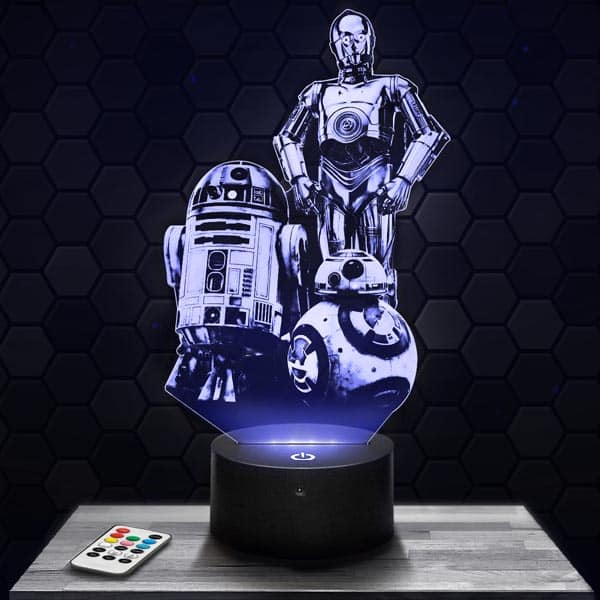 \nCaptivante, attrayante et foncièrement originale La Lampe 3D Star Wars – Droïdes R2-D2 C-3PO BB-8, le cadeau idéal pour toutes les occasions à offrir à vos proches ou pour vous même.Les Lampes sont faites de plaques de plexiglass gravées et découpées au laser dans notre boutique à coté de Clermont Ferrand. L’image s’éclaire à l’allumage du socle donnant un effet d’hologramme étonnant !Pour le salon, la chambre ou bien en veilleuses pour une chambre d’enfant, apportez une nouvelle ambiance lumineuse au cocon familiale.Si vous aimez les atmosphères intimes, en plus de l’effet d’optique déroutant vous serez charmé par la lumière tamisée émise par La Lampe 3D Star Wars – Droïdes R2-D2 C-3PO BB-8.Grace aux socles présentés sur lampephoto.fr, vous pourrez modifier les couleurs sans limites. Directement en touchant la base tactile ou sans même devoir vous déplacer avec la télécommande livrée avec la majorité des multiples socles proposés.Plus qu’à choisir la base lumineuse qui accompagnera votre Lampe 3D Star Wars – Droïdes R2-D2 C-3PO BB-8 !Un des gros points positifs de nos articles est leur faible consommation en énergie. Par les temps qui courent, c’est un facteur à considérer, autant pour l’aspect économique qu’écologique. Les lampes vendues sur notre site ne consomment qu’au maximum 5 watt, si ce n’est même 3 watt pour les moins gourmandesNous garantissons tous nos socles pendant 1 an. La qualité de nos produits est garantie. Si votre article devait être défaillant pendant cette période, nous vous en expédierions un nouveau sans délai. Cependant, cette technologie est assurément durable et a une espérance de vie de minimum cinquante mille heures. Quand on sait qu’une une voiture ayant 200 000 km affichée au compteur kilométrique, ne totalise que seulement 3000 Hrs de route en réalité, le parallèle est parlant…Des questions techniques? Visitez notre FAQDes questions sur la livraison? Cliquez ici\