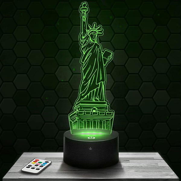 \nAvec son design fascinant, et sa singularité visuelle, La Lampe 3D Statue de la Liberté, le cadeau parfait pour toutes les occasions à offrir en toutes occasions ou pour vous même.\nToutes nos lampes sont fabriquées par notre équipe, en plexiglass de 4 ou 5 mm d’épaisseur et usinées par gravure et découpe laser dans nos bureaux situés à Clermont Ferrand. Le motif s’éclaire à la mise en route du socle donnant un effet d’hologramme fascinant !\nEn lampe de salon, de chevet, ou encore de bureau, donnez un coup de jeune à votre intérieur !\nSi vous aimez les atmosphères feutrées, en plus de l’effet de trompe l’œil fascinant vous serez ravi par la lumière tamisée dégagée par La Lampe 3D Statue de la Liberté.\nGrace aux bases lumineuses présentées sur lampephoto.fr, vous allez pouvoir changer de couleurs sans limites. Directement en touchant la base tactile ou sans même vous déplacer avec la télécommande livrée avec la majorité des différents socles proposés.\nChoisissez le socle lumineux qui illuminera votre Lampe 3D Statue de la Liberté !\nAu niveau de la consommation en électricité, nos lampes se veulent extrêmement eco-friendly. En effet, nos différents produits consomment entre 3 watt et 5 watt, ce qui est clairement peu pour une lampe.\nNous vous garantissons l’entièreté de nos produits pendant 1 an. La qualité est assurée. Si votre article devait être dysfonctionnel durant la première année, nous vous en expédierions un nouveau sans délai. Cela étant, cette technologie est assurément durable et a une longévité d’approximativement 50000 heures. Pour l’exemple, une voiture ayant 200 000 km au compteur kilométrique, n‘accuse en réalité que seulement trois mille heures de fonctionnement en terme de temps, ça en dit long…\n\nDes questions techniques? Visitez notre FAQ\n\nDes questions sur la livraison? Cliquez ici\n