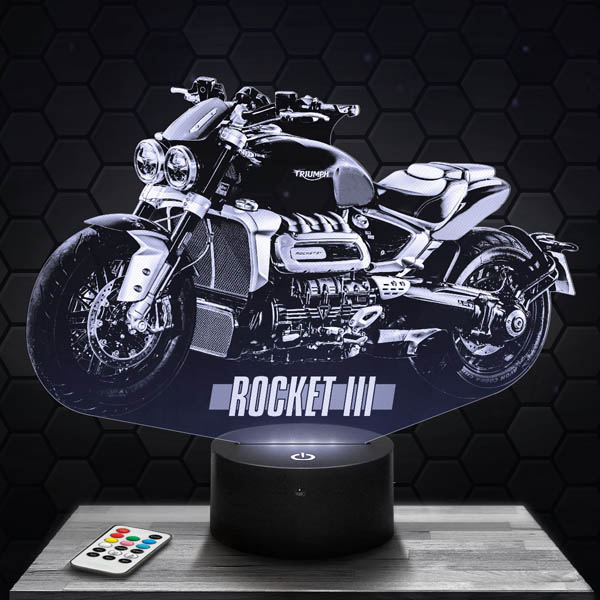Découvrez la Triumph Rocket 3 Moto, une lampe 3D qui ravira tous les motards et motardes. Avec son socle lumineux Noir Led RVB tactile et sa télécommande, cette lampe offre une expérience unique. Fabriquée avec une plaque en verre acrylique gravée en haute définition et découpée au laser dans nos ateliers à Clermont-Ferrand, elle est d’une qualité exceptionnelle. Son visuel s’illumine à l’allumage du socle, créant un effet d’hologramme fascinant. Que ce soit dans le salon, la chambre ou comme lampe de bureau, la Triumph Rocket 3 Moto apportera une touche de style à votre intérieur.