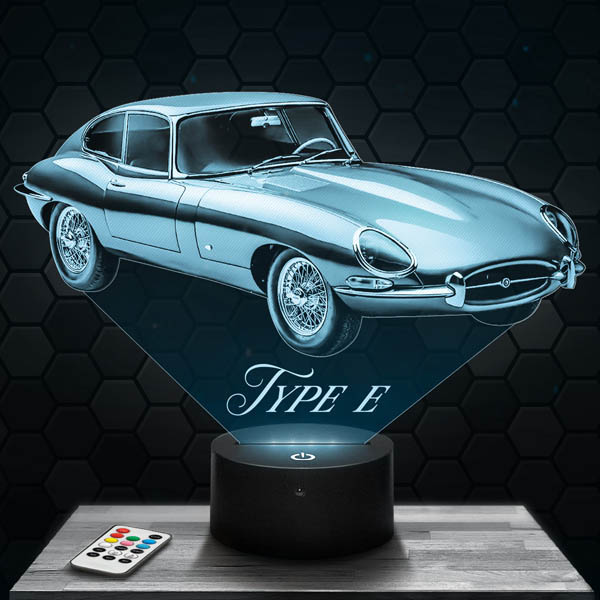 \nDécouvrez la lampe 3D “Voiture Jaguar Type E” de notre collection de lampes 3D. Cette lampe est le choix idéal pour tous les amateurs de voitures de collection. Avec sa plaque en verre acrylique gravée en haute définition et découpée au laser dans nos ateliers à Clermont-Ferrand, cette lampe offre un visuel réaliste et captivant. Son socle lumineux Noir Led RVB tactile avec télécommande permet de choisir parmi 7 couleurs différentes, donnant ainsi un effet d’hologramme fascinant. Que ce soit pour le salon, la chambre ou comme lampe de bureau, la lampe “Voiture Jaguar Type E” apportera une touche d’élégance et de sophistication à votre intérieur.\n