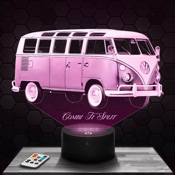\nDécouvrez la lampe Volkswagen Combi T1 Split, un véritable bijou de décoration pour les amateurs de voitures de collection. Avec sa plaque en verre acrylique gravée en haute définition et découpée au laser dans nos ateliers à Clermont-Ferrand, cette lampe 3D offre un rendu visuel exceptionnel. Son socle lumineux Noir Led RVB tactile avec télécommande permet de choisir parmi 7 couleurs différentes, créant ainsi une ambiance personnalisée dans votre salon, votre chambre ou même votre bureau. Lorsque vous allumez la lampe, le visuel s’illumine, donnant un effet d’hologramme fascinant qui ne manquera pas de captiver votre attention.\n