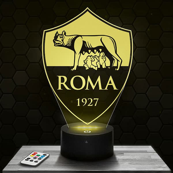 \nConcentré de technologie innovante, La Lampe 3D AS Roma, l’article de décoration du moment !\nLes Lampes sont faites de plaques de plexiglass gravées et découpées au laser dans nos ateliers situés en Auvergne. Le visuel s’illumine à l’allumage du socle donnant un effet d’hologramme fascinant !\nPour le salon, la chambre ou bien comme lampe de bureau, apportez une nouvelle ambiance lumineuse au cocon familiale.\nSi vous aimez les atmosphères feutrées, en plus de l’effet de trompe l’œil captivant vous serez comblé par la lumière tamisée dégagée par La Lampe 3D AS Roma.\nDe plus, vous allez pouvoir choisir le socle que vous souhaitez parmi tous les socles lumineux que nous proposons tel que le socle premium blanc, le socle réveil matin, le socle enceinte Bluetooth… la majorité de nos socles sont tactiles et livrés avec la télécommande pour interchanger les couleurs à votre guise.\nVotre Lampe 3D AS Roma attend vos instructions pour vous être expédiée dès aujourd’hui !\nUn des principaux avantages de nos produits est la faible consommation électrique. Par les temps qui courent, c’est un paramètre à connaitre, tant pour le côté économique que pour celui de l’écologie. Tous nos modèles de lampes proposées sur notre site ne consomment qu’au maximum 5 watt, si ce n’est même 3 watt pour les plus économiques\nAu sujet de la durée de vie de nos lampes 3D, elles sont données pour une espérance de vie d’environ 50000 heures, ce qui correspond si nous faisons un simple calcul, à plus de cinq ans si l’on laisse la lampe allumée 24 heures sur 24, 7 jours sur 7 et 365 jours/an. Au cas où vous seriez confronté à une défaillance matérielle dans la première année, tous les produits vendus sur le site sont garantis 1 an. Nous remplaçons tout produits en panne immédiatement.\n\nDes questions techniques? Visitez notre FAQ\n\nDes questions sur la livraison? Cliquez ici\n
