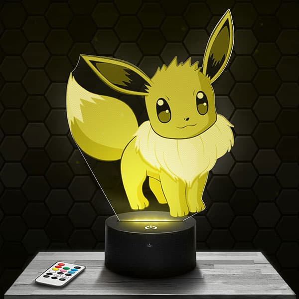 \nEtonnante, attrayante et totalement originale La Lampe 3D Evoli, l’article de décoration du moment !\nLes Lampes sont fabriquées avec des plaques de plexiglass gravées et découpées au laser dans nos ateliers situés en Auvergne. Lors de la mise en marche de la lampe, vous serez impressionné par l’effet d’illusion que cela provoque.\nEn lampe de lecture, d’ambiance, ou encore en veilleuse pour les enfants, donnez un coup de jeune à votre intérieur !\nSi vous aimez les atmosphères intimes, en plus de l’effet d’hologramme fascinant vous serez charmé par la lumière tamisée dégagée par La Lampe 3D Evoli.\nGrace aux socles proposés sur lampephoto.fr, vous changerez de couleurs sans limites. Simplement en touchant le socle tactile ou sans même avoir à vous déplacer grâce à la télécommande disponible avec la plupart des multiples socles proposés.\nVotre Lampe 3D Evoli attend vos instructions pour vous être expédiée dès maintenant !\nUn des principaux points positifs de nos articles est la faible consommation en énergie. De nos jours, c’est un facteur à auquel il faut s’attacher, autant pour l’aspect économique que celui de l’écologie. Tous nos modèles de lampes proposées via notre site web ne consomment qu’au maximum 5W, voir même 3 watt pour certains socles lumineux\nParlons de l’espérance de vie de nos lampes 3D, elles sont fabriquées pour une durée minimum de cinquante mille heures, ce qui correspond si nous faisons un rapide calcul, à plus de cinq ans en gardant la lampe en fonction 24H/24, 7/7 jours et 365 jours par an. Dans le cas où vous seriez confronté à un souci technique dans la première année, tous les produits vendus sur le site sont garantis 1 an. Nous remplaçons tous les socles en panne immédiatement.\n\nDes questions techniques? Visitez notre FAQ\n\nDes questions sur la livraison? Cliquez ici\n