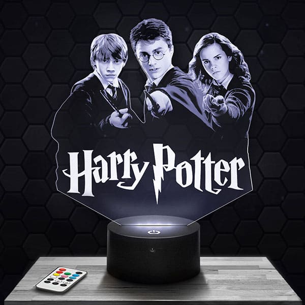 \nDéroutante, innovante et totalement originale La Lampe 3D Harry Potter, le cadeau idéal pour les amis, la famille, les enfants, à offrir à ceux que vous aimez ou pour se l’offrir à soit même.\nToutes nos créations sont Elaborées par nos techniciens, à partir de plexiglass de 4 ou 5 mm d’épaisseur et transformées avec nos machines de gravure et découpe laser dans nos locaux situés en Auvergne. Le visuel s’éclaire à la mise en route du socle donnant un effet d’hologramme étonnant !\nEn lampe de lecture, d’ambiance, ou encore de bureau, donnez une touche moderne à votre intérieur !\nSi vous aimez les atmosphères feutrées, en plus de l’effet de trompe l’œil captivant vous serez ravi par la lumière tamisée émise par La Lampe 3D Harry Potter.\nGrace aux socles proposés sur lampephoto.fr, vous allez pouvoir changer de couleurs à volonté. Directement en touchant le socle tactile ou sans même avoir à vous déplacer avec la télécommande disponible avec la plupart des différents socles proposés.\nPlus qu’à choisir le socle lumineux qui sublimera votre Lampe 3D Harry Potter !\nParlons un peu de la consommation électrique, nos lampes se veulent extrêmement eco-friendly. En effet, chacun de nos produits consomment entre 3 watt et 5 watt, ce qui est clairement peu pour un appareil électrique.\nAu sujet de la longévité de nos lampes 3D, elles sont fabriquées pour une espérance de vie minimum de cinquante mille heures, ce qui correspondrai si nous prenons le temps de faire un simple calcul, à plus de cinq ans si l’on laisse la lampe allumée 24 heures sur 24, 7 jours sur 7 et 365 jours par an. Au cas où vous seriez confronté à une défaillance matérielle dans les premiers temps, tous les produits du site internet sont garantis 1 an. Nous remplaçons les socles défectueux immédiatement.\n\nDes questions techniques? Visitez notre FAQ\n\nDes questions sur la livraison? Cliquez ici\n