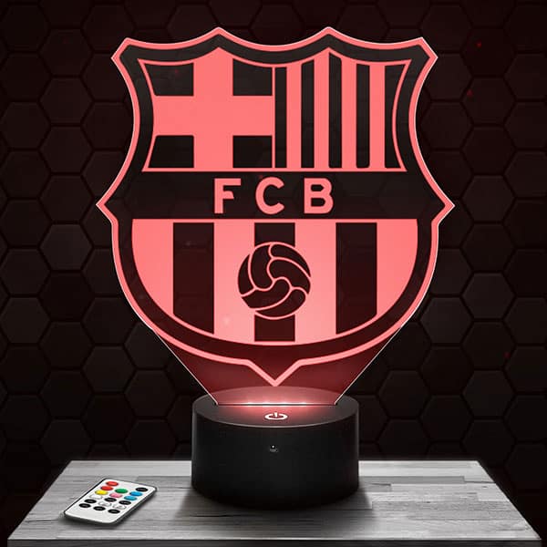 \nFascinante, surprenante et foncièrement originale La Lampe LED 3D Logo FCB Barcelone, le cadeau parfait pour toutes les occasions à offrir à ceux que vous aimez ou pour se faire plaisir à soit même.\nToutes nos créations sont fabriquées par notre équipe, à partir de plexiglass de 4 ou 5 mm d’épaisseur et usinées avec nos machines de découpe et gravure laser dans nos bureaux situés à Clermont Ferrand. Le motif s’illumine à l’allumage du socle donnant un effet d’hologramme surprenant !\nPour le salon, la chambre ou bien en veilleuses pour une chambre d’enfant, apportez une nouvelle ambiance lumineuse à la maison.\nEn plus de l’illusion d’optique incomparable, la Lampe LED 3D Logo FCB Barcelone émettra une lumière tamisée parfaite pour vos ambiances entres amis.\nPour finir, vous pourrez choisir la base lumineuse que vous souhaitez parmi tous les modèles proposés tel que le socle basique, le socle horloge, le socle enceinte Bluetooth… La plupart de nos socles sont tactiles et livrés avec la télécommande multifonction pour modifier les couleurs à votre guise.\nVotre Lampe LED 3D Logo FCB Barcelone attend vos instructions pour vous être envoyée dès maintenant !\nAu niveau de la consommation en énergie, la totalité de nos lampes 3D se veulent très clairement écologiques. De ce fait, chacun de nos produits consomment de 3 à 5 watt, ce qui est extrêmement peu pour un appareil électrique.\nAu sujet de la longévité de nos lampes 3D, elles sont fabriquées pour une durée de fonctionnement moyenne de cinquante mille heures, ce qui correspondrai si nous faisons un rapide calcul, à plus de cinq ans si l’on laisse la lampe 3D allumée 24H/24, 7/7 jours et 365 jours/an. Au cas où vous seriez confronté à une défaillance matérielle dans la première année, tous les articles du site internet sont garantis 1 an. Nous échangeons tout produits défectueux dans les plus brefs délai.\n\nDes questions techniques? Visitez notre FAQ\n\nDes questions sur la livraison? Cliquez ici\n