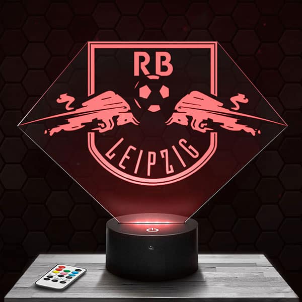 \nÀ la fois innovante et originale La Lampe 3D RB Leipzig, la touche déco du moment !\nLes Lampes 3D sont conçues à partir de plaques de plexiglass gravées et découpées au laser dans nos locaux situés à Clermont Ferrand. Lors de l’allumage de la lampe, vous serez bluffé par l’effet d’hologramme que cela provoque.\nPour vos pièces de vie ou bien en veilleuses pour une chambre d’enfant, ajoutez une touche de modernisme au cocon familiale.\nSi vous aimez les atmosphères intimes, en plus de l’effet d’hologramme déroutant vous serez comblé par la lumière tamisée dégagée par La Lampe 3D RB Leipzig.\nEt ce n’est pas tout, vous allez pouvoir choisir le socle que vous préférez parmi tous les modèles présentés comme le socle premium blanc, le socle horloge, le socle enceinte Bluetooth… La plupart de nos socles sont tactiles et livrés avec une télécommande multifonction pour modifier les couleurs à votre guise.\nVotre Lampe 3D RB Leipzig attend vos instructions pour vous être expédiée aujourd’hui même !\nAu niveau de la consommation en énergie, nos lampes se veulent vraiment eco-friendly. En effet, chacun de nos modèles consomment entre 3 watt et 5 watt, ce qui est extrêmement peu pour un appareil électrique.\nNos engagements : vous garantir tous nos produits pendant 1 an. La qualité est garantie. Si votre article était amené à être dysfonctionnel pendant cette période de 1 an, nous vous en expédierions un nouveau dans les plus brefs délais. Cependant, ce matériel est assurément fiable et a une durée de vie d’approximativement 50 000 heures. Pour le parallèle, une automobile ayant 200 000 km affichée au compteur kilométrique, n’a en fait que seulement 3000 Hrs de route en réalité, ça en dit long…\n\nDes questions techniques? Visitez notre FAQ\n\nDes questions sur la livraison? Cliquez ici\n