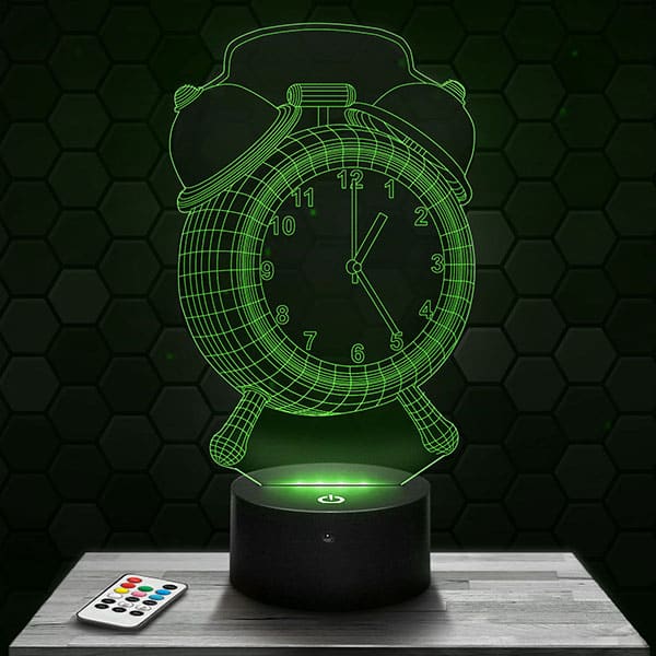 \nDéroutante, surprenante et foncièrement originale La Lampe LED 3D Réveil Matin, le cadeau parfait pour les amis, la famille, les enfants, à offrir en toutes occasions ou pour vous même.\nLes Lampes sont faites de plaques de plexiglass gravées et découpées au laser par nos soins dans le Puy de Dôme. Lors de la mise en marche de la lampe, vous serez fasciné par l’effet d’hologramme que cela provoque.\nPour le salon, la chambre ou bien comme lampe de bureau, apportez une pointe de modernisme à la maison.\nSi vous aimez les atmosphères intimes, en plus de l’effet de trompe l’œil captivant vous serez charmé par la lumière tamisée que vous offrira La Lampe LED 3D Réveil Matin.\nPour finir, vous allez pouvoir choisir le socle de votre choix parmi tous les socles lumineux proposés comme le socle basique, le socle horloge, le socle enceinte Bluetooth… La plupart de nos socles sont tactiles et livrés avec la télécommande pour changer les couleurs à votre guise.\nChoisissez le socle lumineux qui illuminera votre Lampe LED 3D Réveil Matin !\nUn des principaux points positifs de nos articles est leur faible consommation en énergie. De nos jours, c’est un facteur à considérer, autant pour l’aspect économique que pour celui de l’écologie. Toutes les lampes 3D vendues sur le site lampephoto.fr ne consomment qu’au maximum 5W, si ce n’est même 3 watt pour les plus économiques\nPour ce qui est de la longévité de nos lampes 3D, elles sont fabriquées pour une espérance de vie moyenne de 50000 heures, ce qui équivaut si nous faisons le calcul, à plus de cinq ans en laissant la lampe allumée 24H/24, 7/7 jours et 365 jours/an. Dans le cas où vous seriez confronté à une défaillance matérielle dans les premiers temps, tous les produits du site lampephoto.fr sont garantis 1 an. Nous échangeons tous les socles dysfonctionnels très rapidement.\n\nDes questions techniques? Visitez notre FAQ\n\nDes questions sur la livraison? Cliquez ici\n