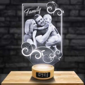Composé d’une base LED illuminée et d’une plaque en plexiglas gravée et découpée au laser qui s’insère dans la base, la photo gravée s’illumine pour donner un effet hologramme impressionnant !
