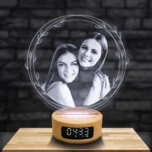 Composé d’une base LED illuminée et d’une plaque en plexiglas gravée et découpée au laser qui s’insère dans la base, la photo gravée s’illumine pour donner un effet hologramme impressionnant !